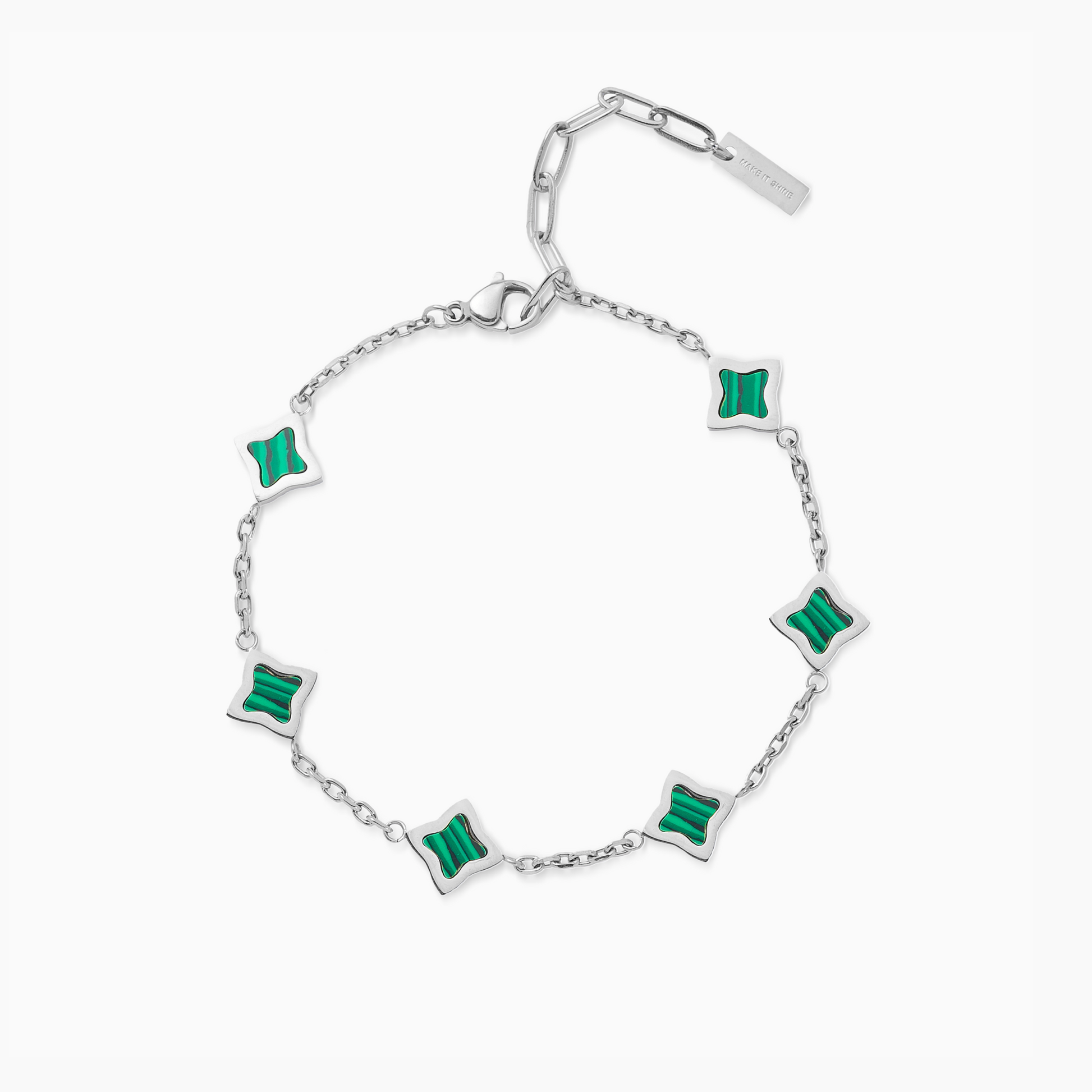 Découvrez notre Bracelet Flower, une pièce exquise qui marie l'élégance intemporelle de la chaîne câble et la délicatesse des fleurs. Chacune des fleurs, ornée d'une pierre imitation malachite et d'une épaisseur de 8 mm, ajoute une touche de charme et de sophistication à ce bracelet de 2 mm.
