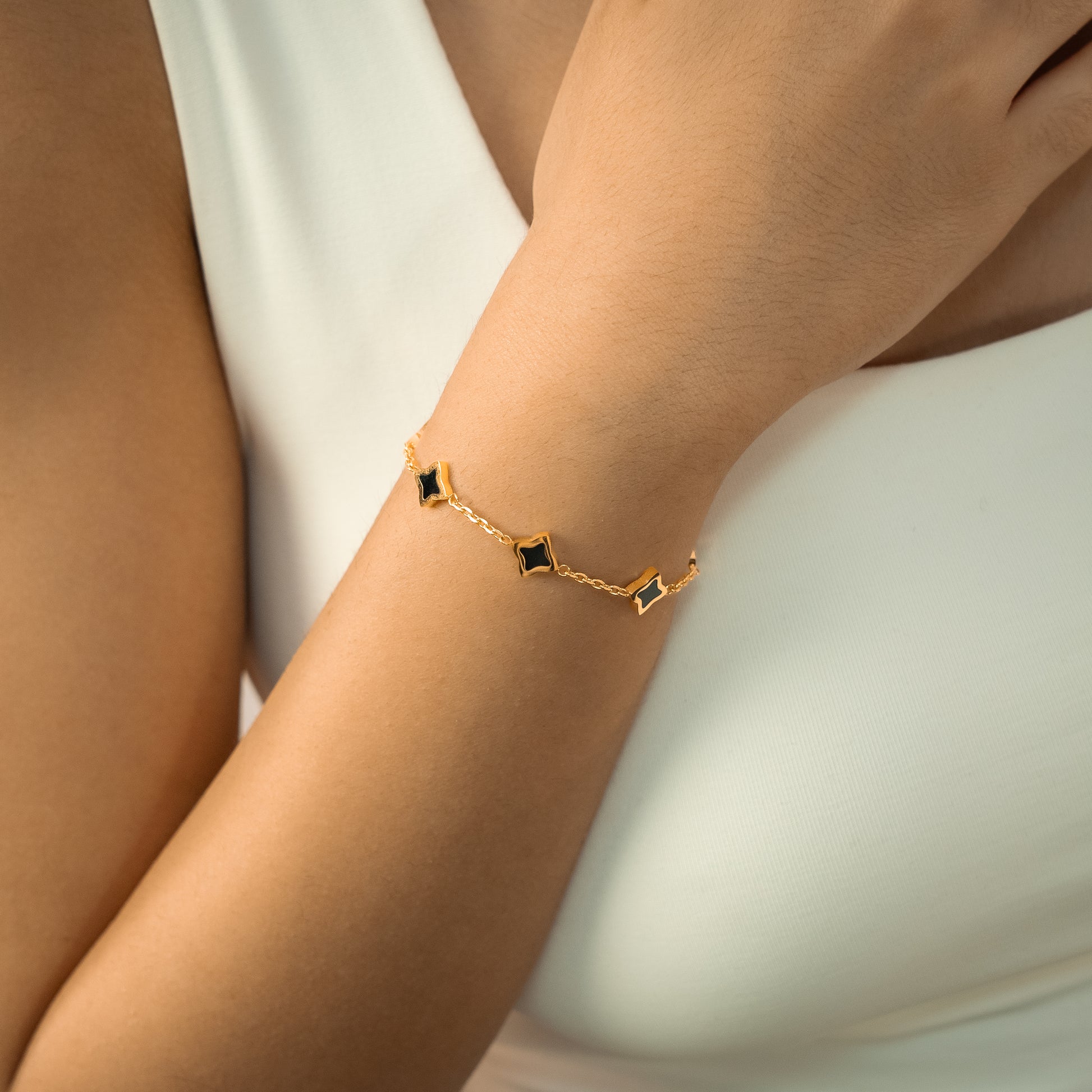 Découvrez notre Bracelet Flower, une pièce exquise qui marie l'élégance intemporelle de la chaîne câble et la délicatesse des fleurs. Chacune des fleurs, ornée d'une pierre imitation onyx et d'une épaisseur de 8 mm, ajoute une touche de charme et de sophistication à ce bracelet de 2 mm.
