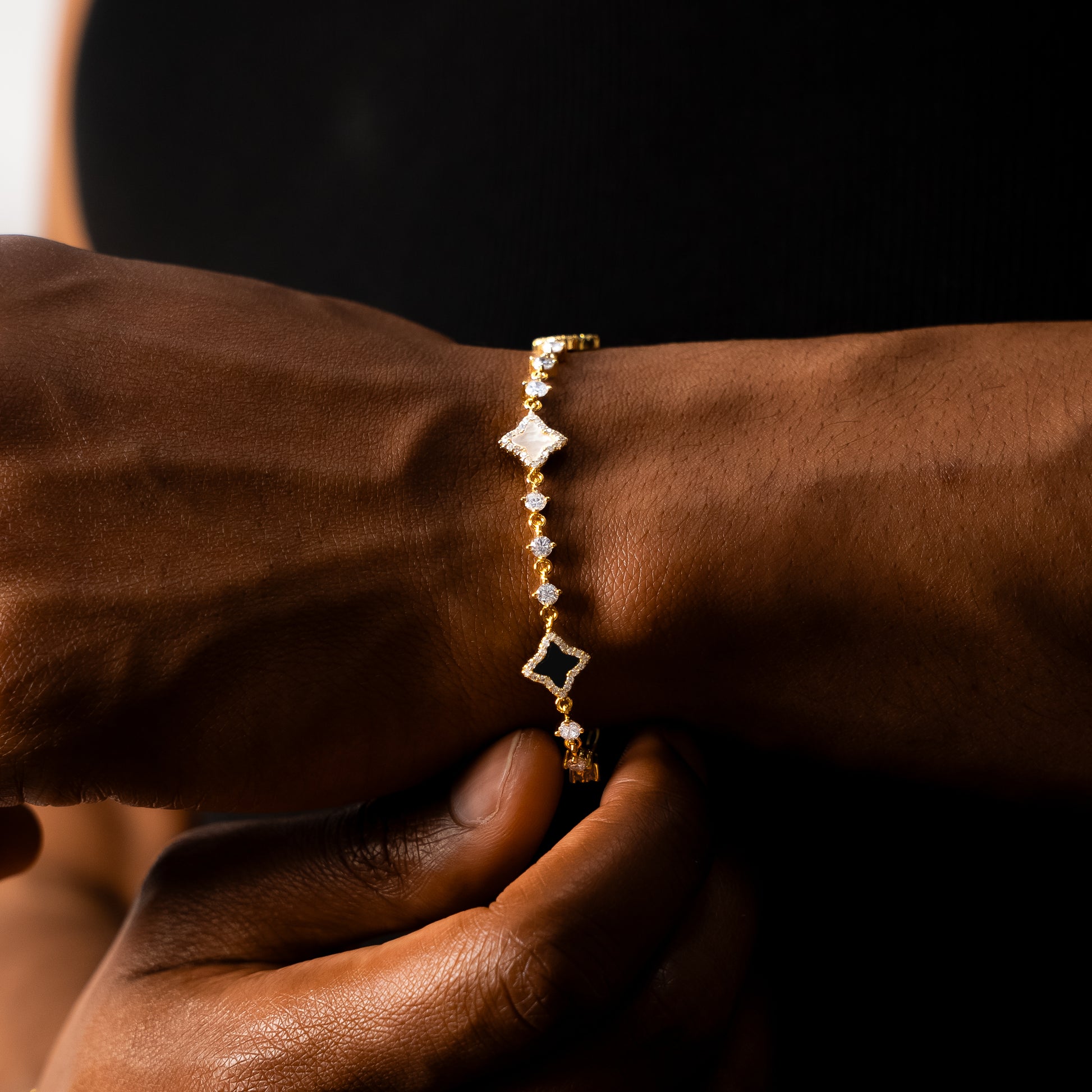 Découvrez notre Bracelet Flower Tennis, une pièce exquise qui marie l'élégance intemporelle du bracelet tennis et la délicatesse des fleurs. Chacune des fleurs, ornée d'une pierre imitation nacre ou onyx et d'une épaisseur de 8 mm, ajoute une touche de charme et de sophistication à ce bracelet de 3 mm.
