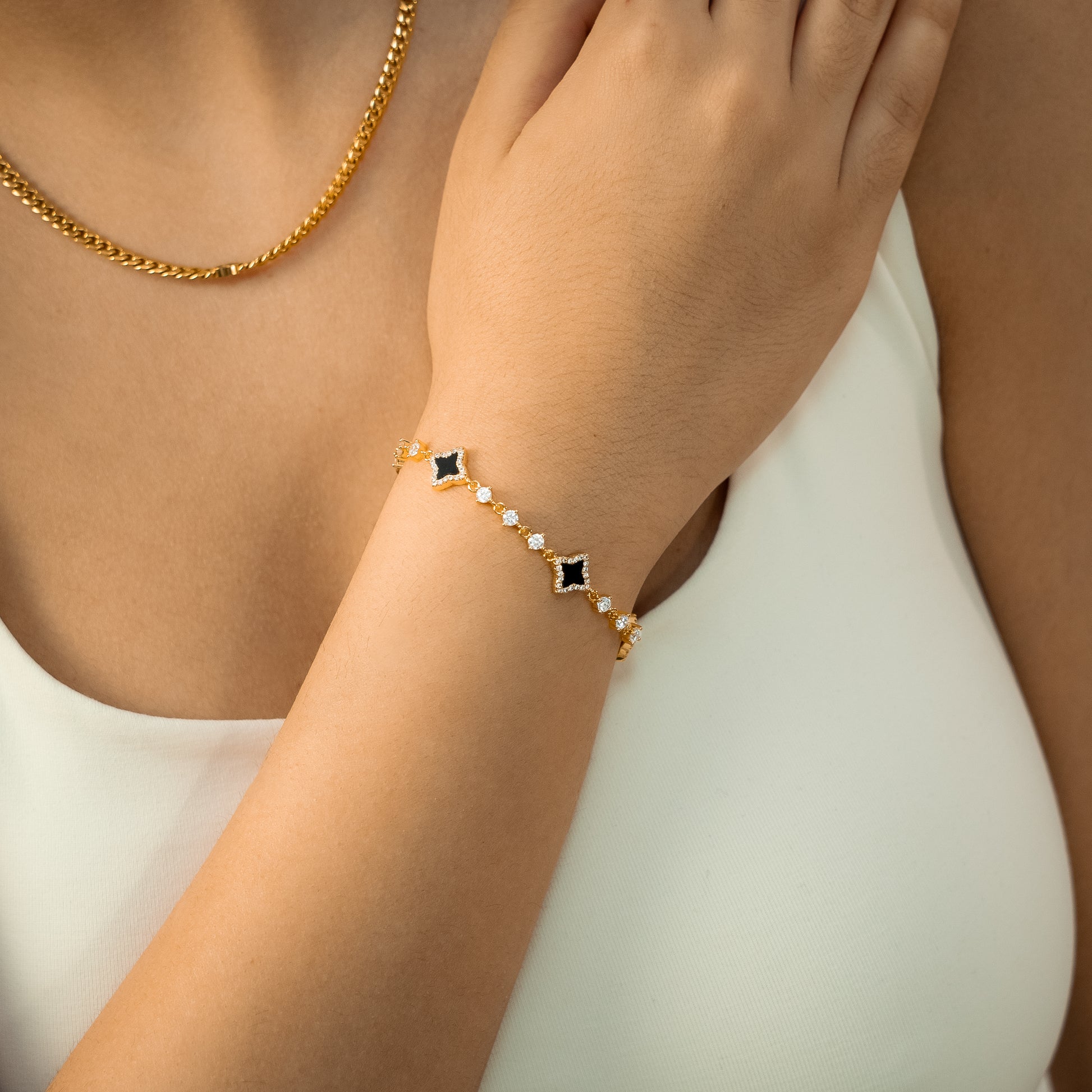 Découvrez notre Bracelet Flower Tennis, une pièce exquise qui marie l'élégance intemporelle du bracelet tennis et la délicatesse des fleurs. Chacune des fleurs, ornée d'une pierre imitation onyx et d'une épaisseur de 8 mm, ajoute une touche de charme et de sophistication à ce bracelet de 3 mm.