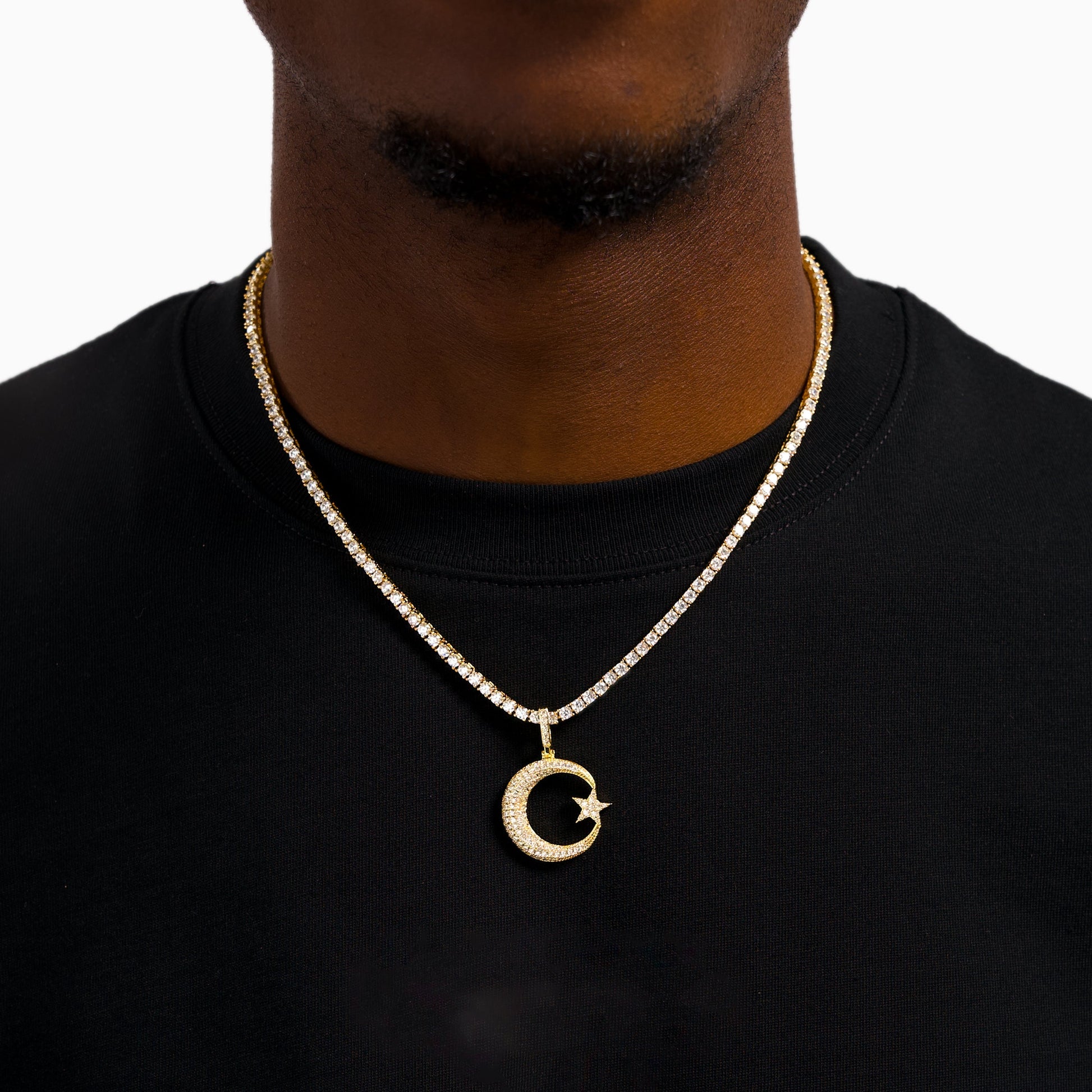 Notre pendentif Croissant de lune, une pièce captivante de 3 cm. Orné d'oxydes de zirconium, tant le croissant de lune que l'étoile étincelante entre ses extrémités ajoutent une touche d'éclat à votre style.