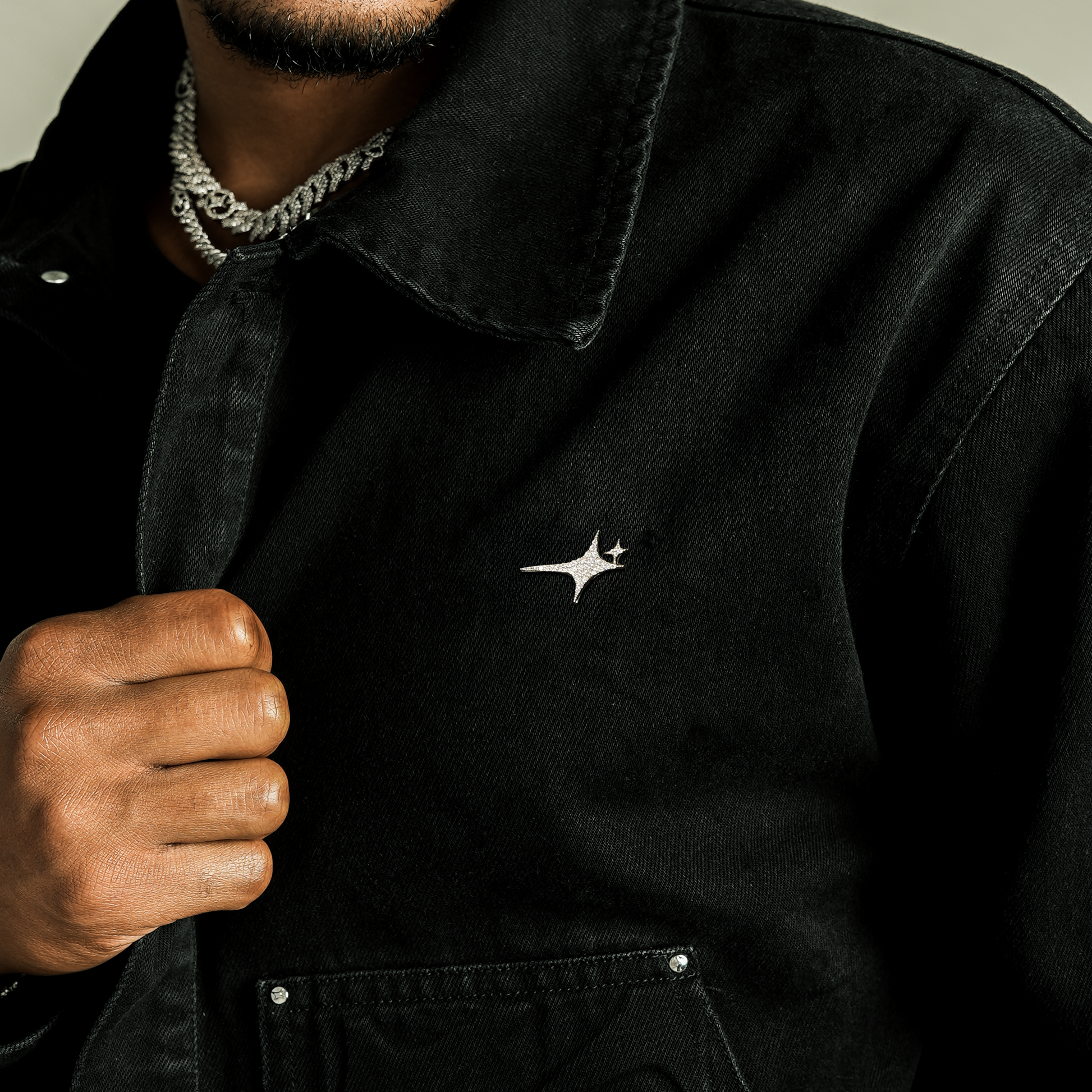 Veste en denim noir à manches longues avec une coupe droite. Monogramme embossé en relief sur les poches avant. Col structuré, fermeture boutonnée avec boutons métalliques argentés. Logo Make It Shine orné de pierres moissanite sur la poitrine. “Make It Shine” brodé en blanc au dos.