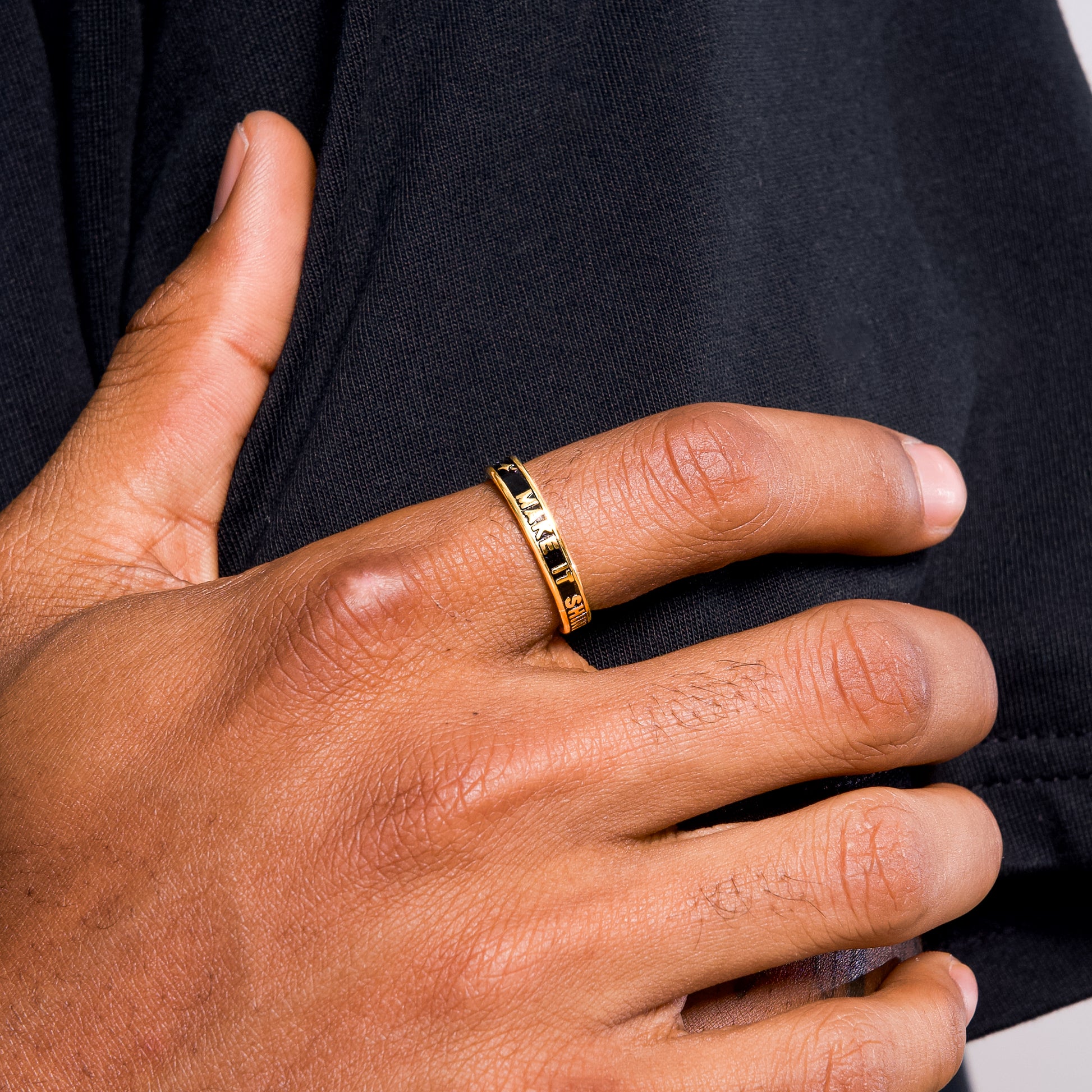 Découvrez notre bague Make it Shine, un anneau de 4 mm peint avec de la peinture émail noire et subtilement marqué du nom de notre marque "Make it Shine".