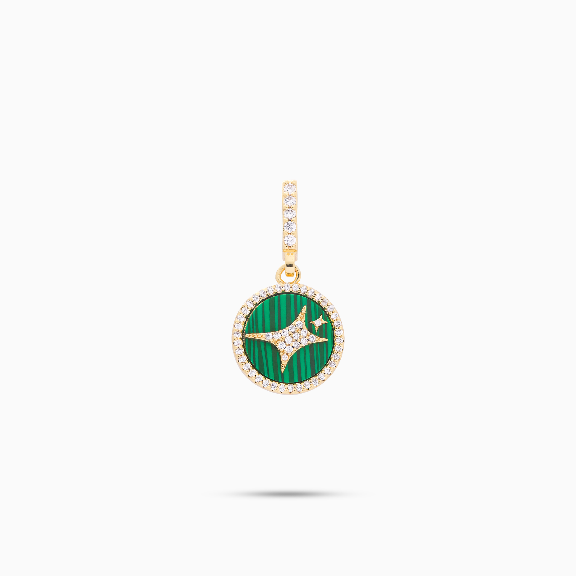 Découvrez notre médaillon Signature, un bijou éclatant qui sublime notre célèbre logo étoilé. D'un diamètre de 1,5 cm, ce pendentif raffiné est orné d'une pierre imitation malachite et d'oxydes de zirconium étincelants, mettant en lumière notre étoile au centre. Parfait pour ajouter une touche de sophistication et de brillance à vos tenues.