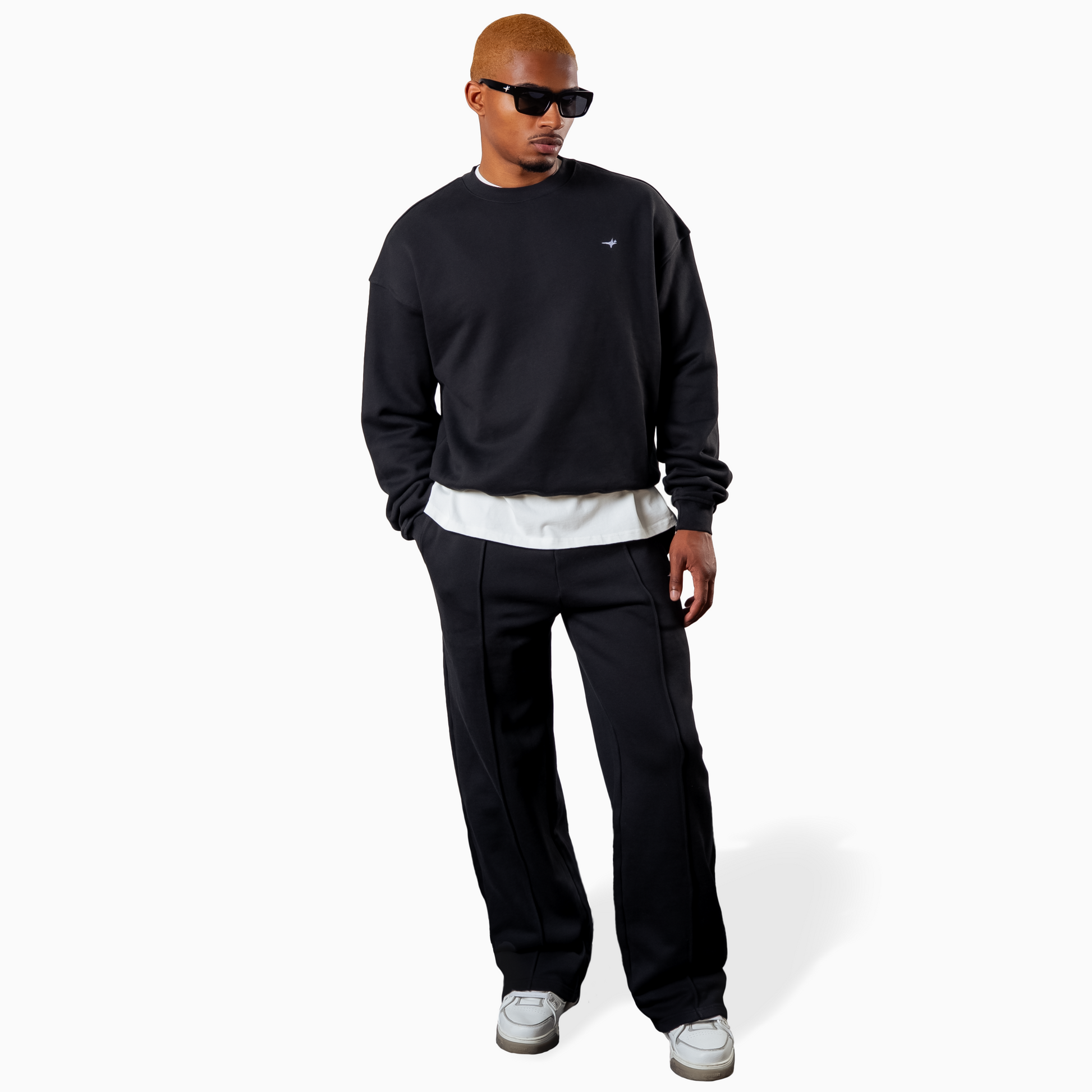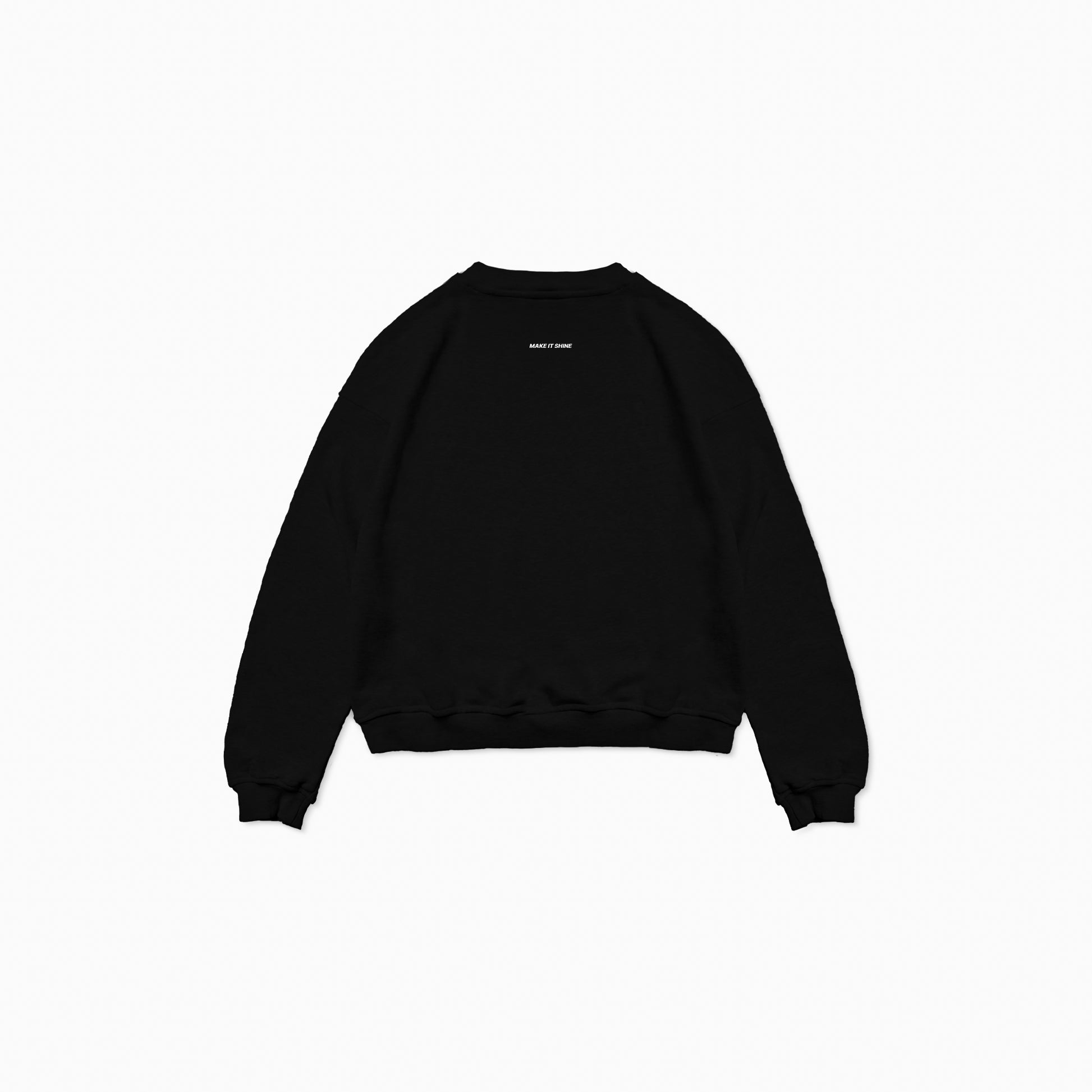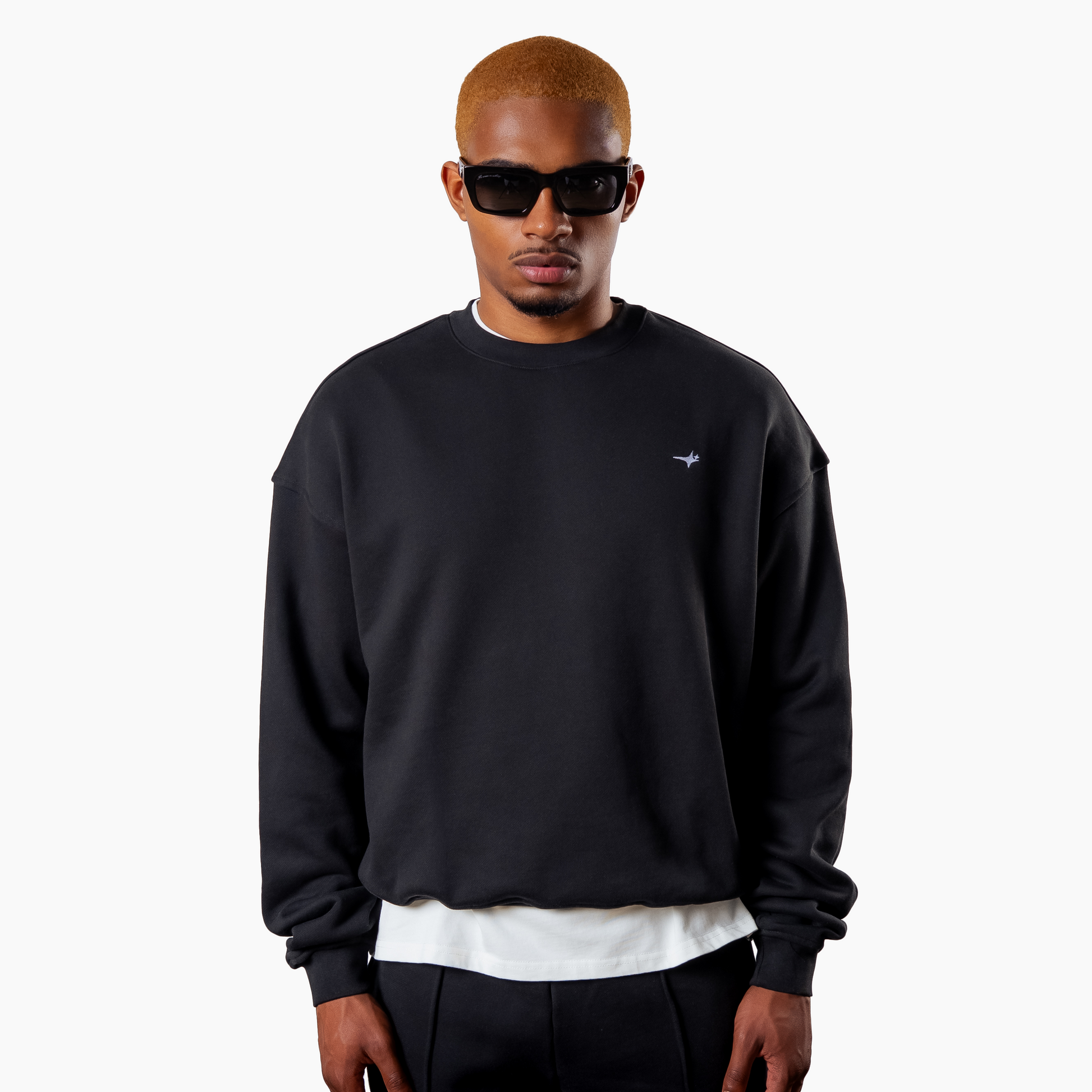 Sweater noir en jersey à manches longues avec une coupe oversize, fabriqué à partir d'un coton épais de qualité supérieure. Col ras de cou côtelé.