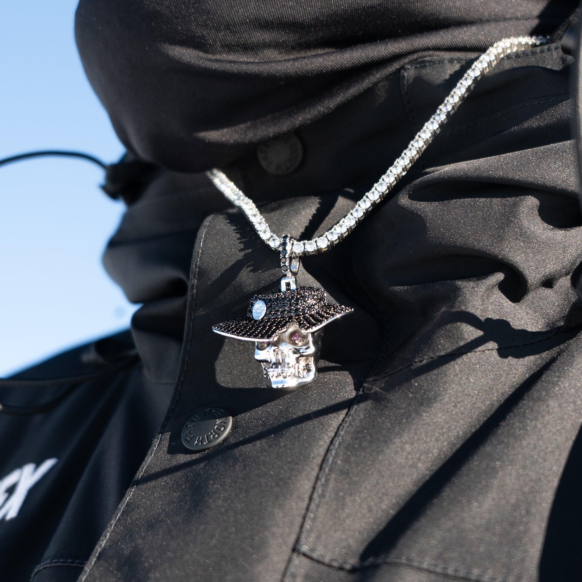 Découvrez notre pendentif exclusif "The Last Pirate", une création conçue en collaboration avec le combattant UFC Morgan Charrière. Cette tête de mort unique, avec des yeux en pierres roses et un chapeau de pirate orné de pierres noires, incarne l'esprit intrépide du célèbre pirate.