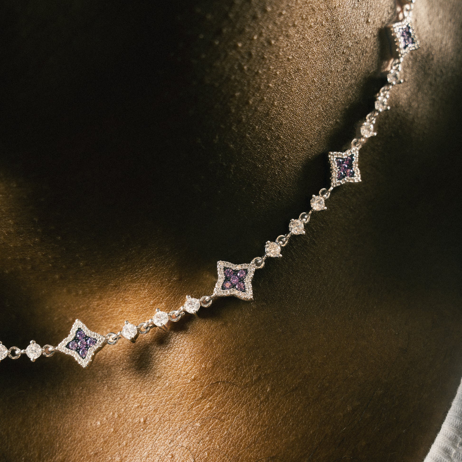 Discover our Flower Tennis Chain, an exquisite piece that combines the timeless elegance of the tennis chain with the delicacy of flowers. Each of the flowers, adorned with sparkling purple stones and measuring 8 mm thick, adds a touch of charm and sophistication to this 3 mm chain.