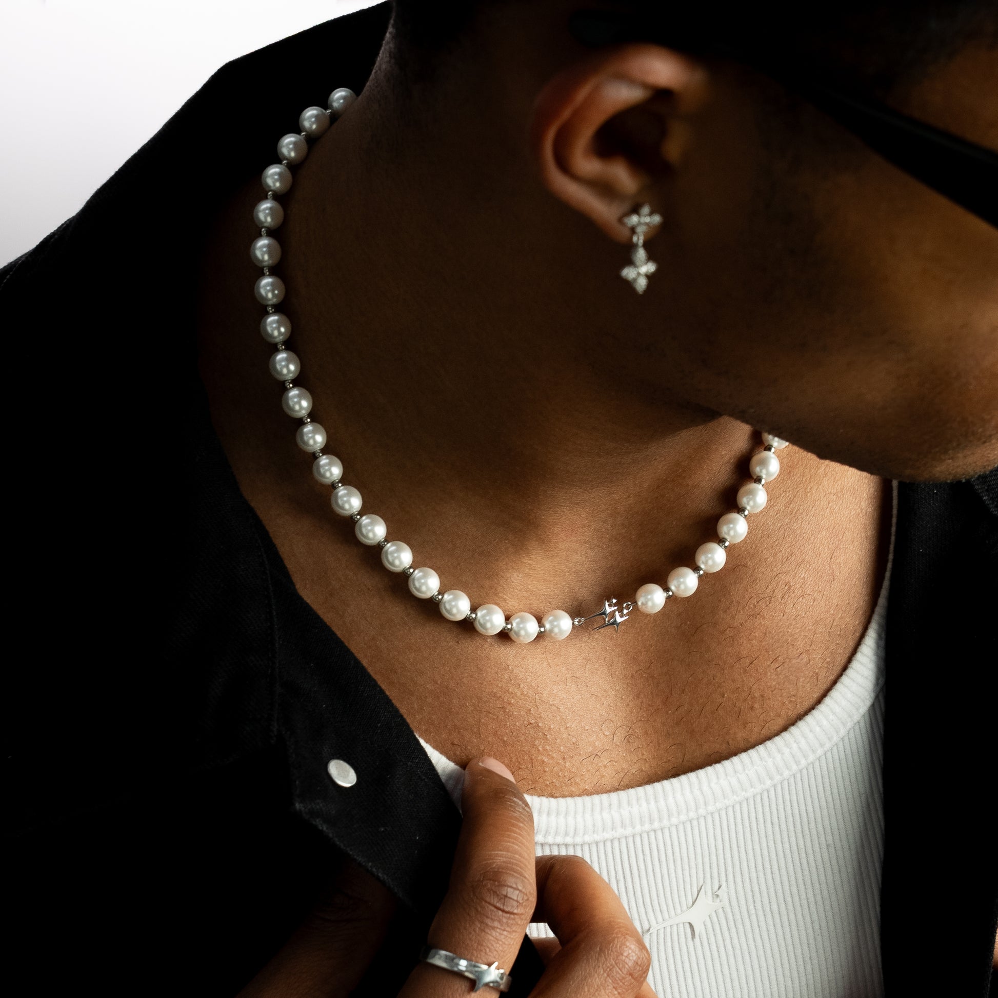 Discover our Double Stars beaded chain , a piece that is both minimalist and dazzling. Made of 8mm white pearls, it features a centrally positioned double Make it Shine logo, adding a subtle and elegant touch. A sleek creation that combines softness and character, ideal for completing a refined look with a discreet signature.