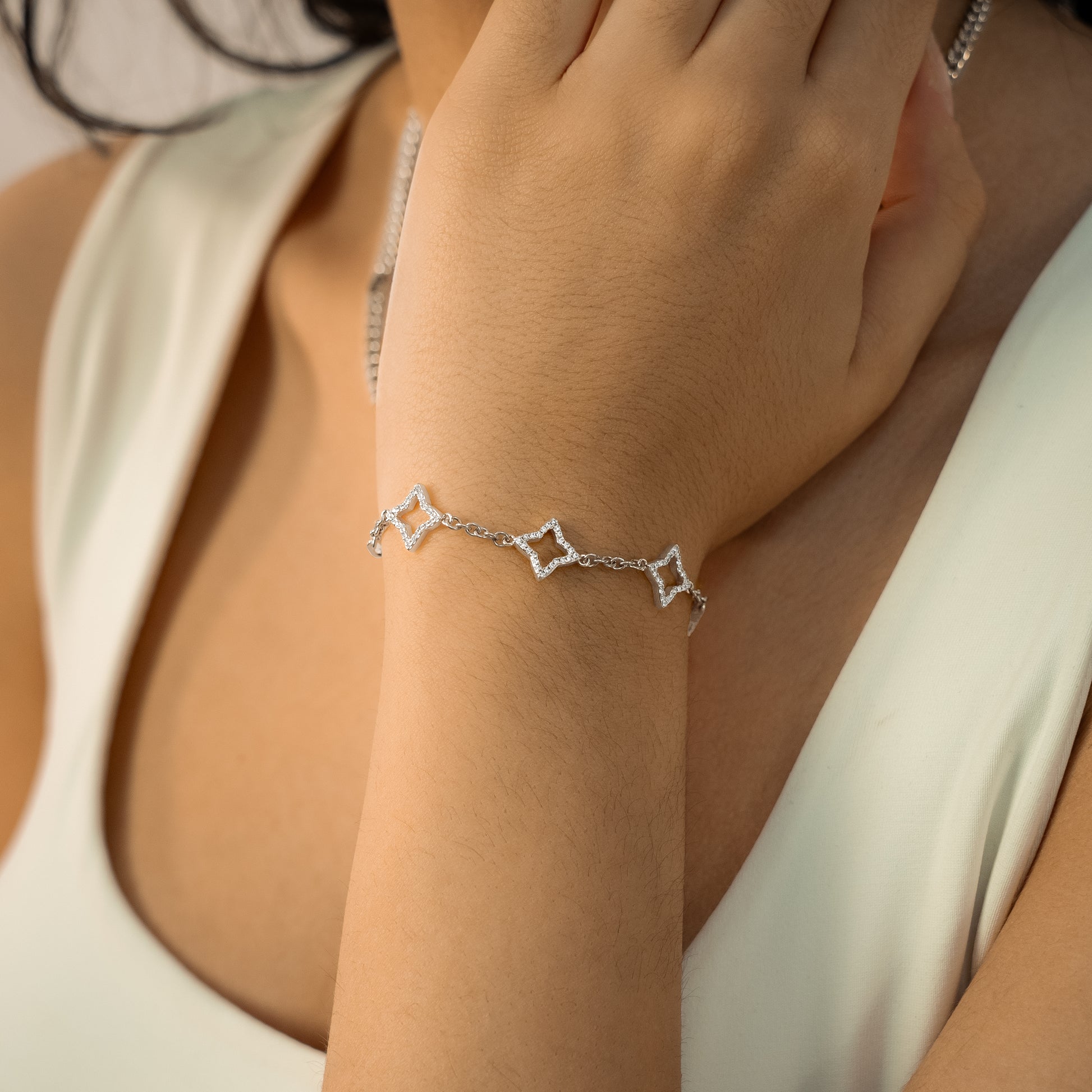 Discover our Hollow Shiny Flower Bracelet, a piece that captures the essence of sophistication. Each flower on this 3mm cable chain is beautifully accented with sparkling stones, offering a subtle and refined sparkle.