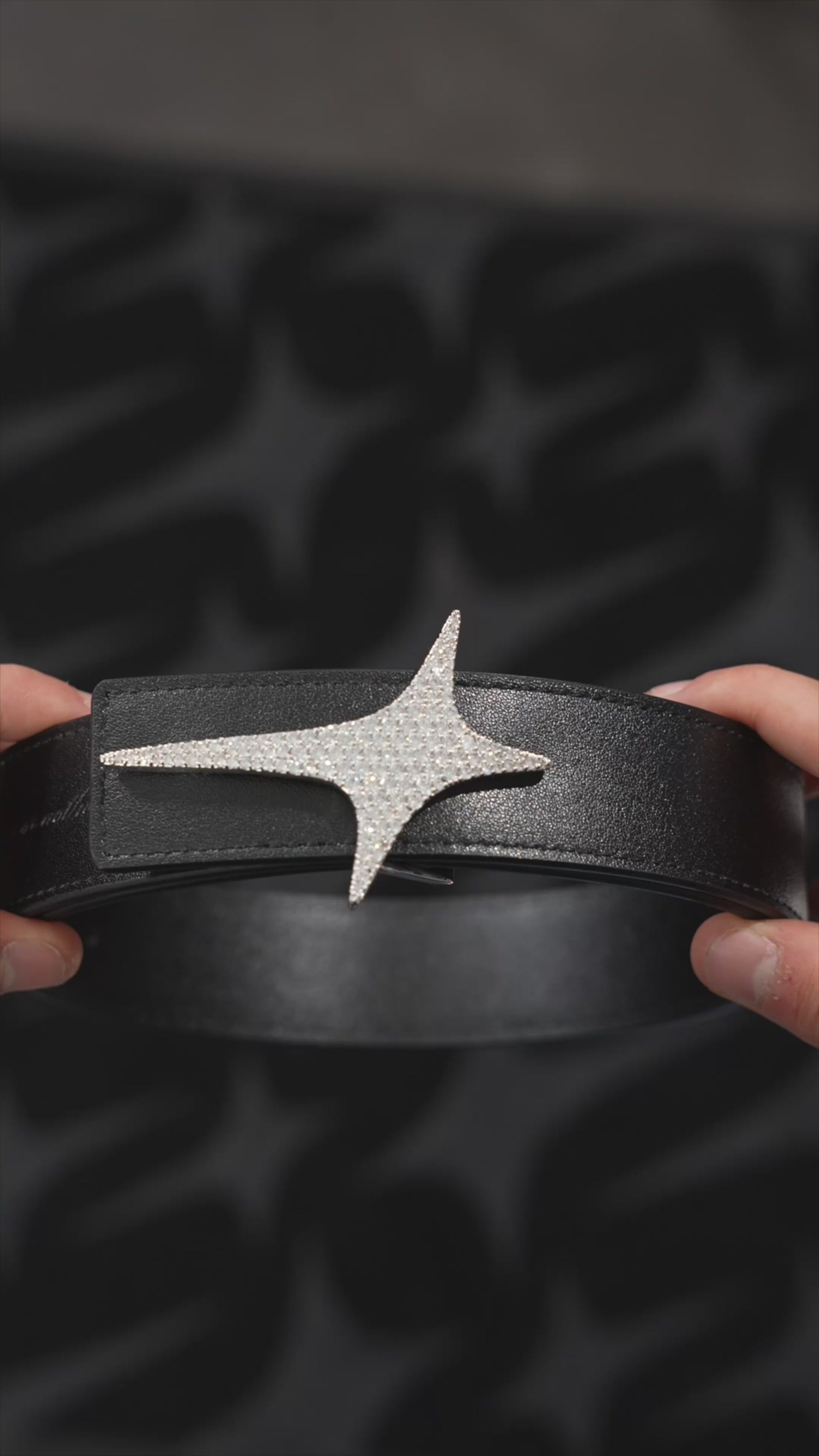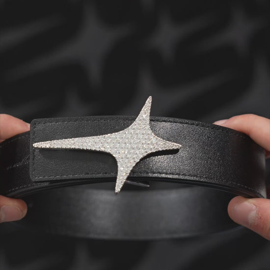 Genuine black leather belt. Silver-tone metal Make it Shine logo buckle, adorned with zirconia. Shiny finish and intricate details for a bold style. On the back, tone-on-tone debossed “As Sirius or Nothing” inscription.