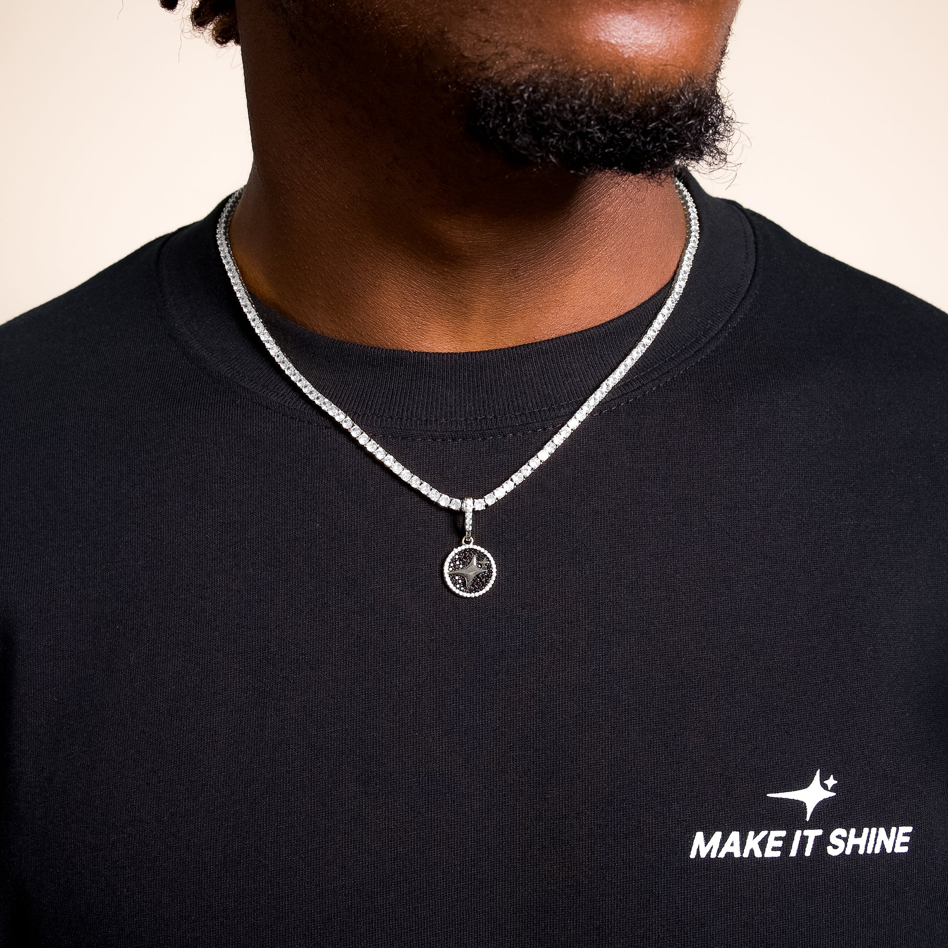 Discover our Signature Medallion, a radiant piece of jewelry that enhances our iconic star logo. With a diameter of 1.5 cm, this refined pendant is adorned with sparkling black and white cubic zirconia, highlighting our central star. Perfect for adding a touch of sophistication and brilliance to your outfits.