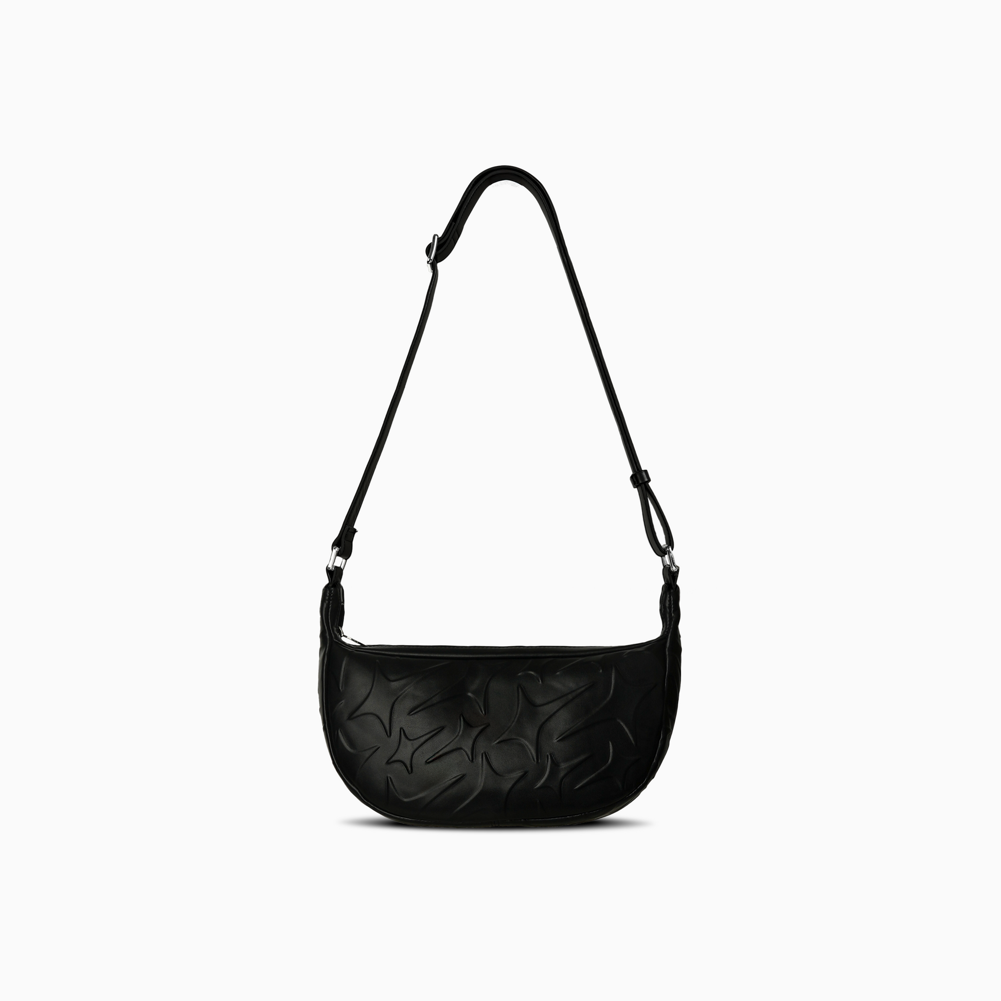 The Monogram Messenger Bag, crafted in black faux leather, revisits an urban essential with a sophisticated and bold design. More spacious (35 x 20 x 9 cm), it combines practicality and aesthetics thanks to its adjustable shoulder strap and functional interior. Its style is enhanced by the embossed Make It Shine monogram, which creates a unique relief, and by the 3 cm metallic logo set with moissanite stones, for an extra touch of character.