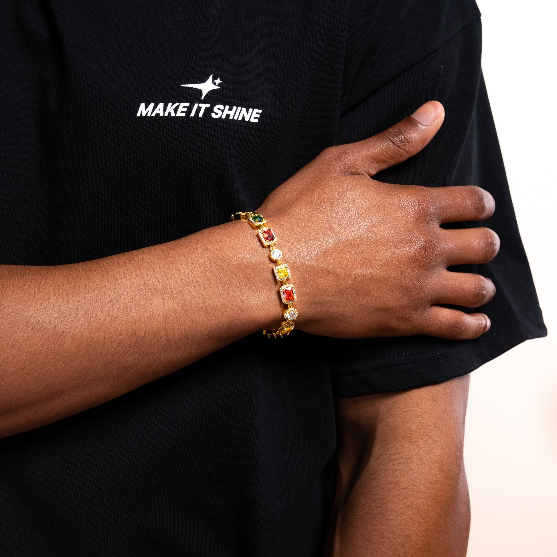 Discover our Multi Gemstone Bracelet, an exquisite piece that captivates with its beauty and brilliance. Each stone, varying in shape and color (yellow, red, green, and purple), is carefully selected to create a captivating visual harmony. With gems measuring 8 mm thick, this bracelet offers a true array of vibrant colors.