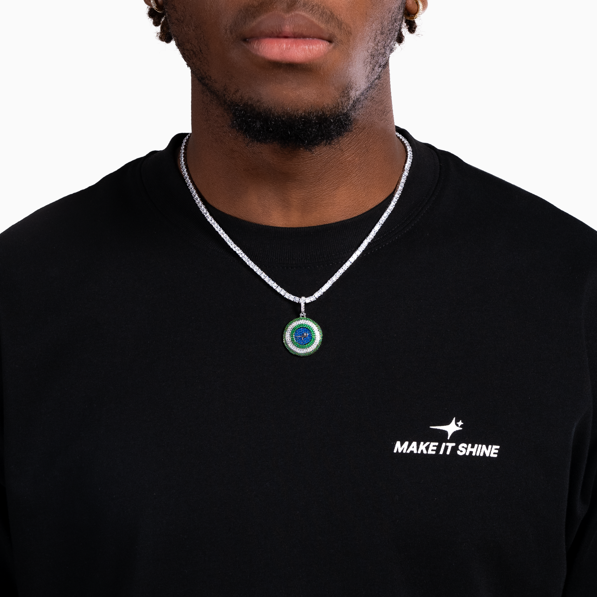 Discover the exclusive Star Keeper pendant, a symbolic creation made in collaboration with the Tonsser team. Inspired by the strength of a shield, this jewel represents resilience and protection in the field. Adorned with concentric circles of green, white and blue zirconia, it proudly surrounds the Make it Shine logo in its center, a symbol of strength and determination.